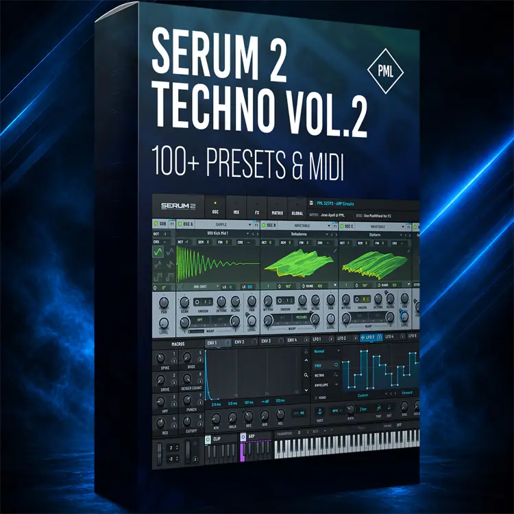 Techno Vol.2 traz mais de 100 presets e 100 arquivos MIDI inspirados em nomes como Adriatique, Space92, Enrico Sangiuliano, Argy e Anyma. Inclui basses, leads, plucks, arps e atmos para techno moderno.